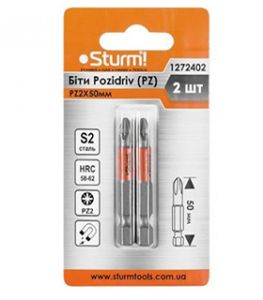 Насадка (біта) Sturm PZ2 – подовжена (50 мм) одностороння біта – призначена для відкручування та закручування кріпильних виробів з типом шліцю PZ2. На відміну від класичних хрестоподібних біт PH, біти з шліцом PZ мають додаткову насічку, що забезпечує краще зачеплення. За рахунок універсального шестигранного хвостовика розміром ? дюйма біта може використовуватися як для ручного, так і для електроінструменту (акумуляторні викрутки, шуруповерти, дрилі). (HRC 58 – 62) та зносостійкістю. Для запобігання вислизу з кріплення робоча частина біти намагнічена.