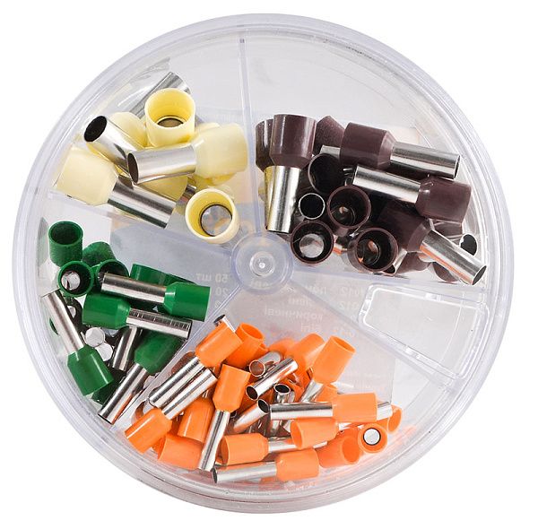 Набір наконечників Е-100 АсКо (100 шт./уп) – це комплект ізольованих трубчастих наконечників, призначений для обтиску багатожильних проводів з метою їх подальшого підключення до різноманітного електричного обладнання (автоматичних вимикачів, розеток, клемних колодок тощо). Використання наконечників забезпечує надійне та якісне з'єднання, запобігає розпушуванню провідників та полегшує монтаж. Комплектація: 100 шт - HT4-12, HT6-12, HT10-12, HT16-12.