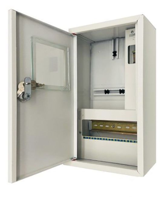 Шкаф распределительный под разное количество модулей с закрывающейся на замок дверью. Модули крепятся на дин-рейку шиной 35 мм. Места под счетчик нет, форма шкафа прямоугольная.