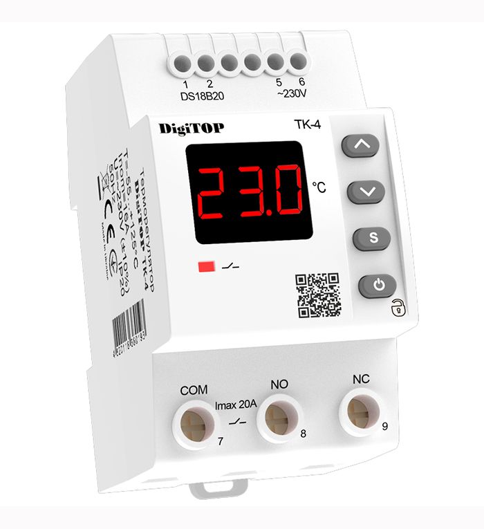 Одноканальный электронный регулятор температуры (далее терморегулятор) ТК-4 предназначен для поддержания заданной попьзоватепем температуры объекта с отображением значений на встроенном цифровом светодиодном индикаторе. Терморегулятор управляется микроконтроллером, измерительным элементом служит цифровой датчик температуры DS18B20. Для управления нагрузкой используется электромагнитное реле. Установки пользователя вводятся в прибор с помощью кнопок, расположенных на передней панели прибора. Все устанавливаемые значения сохраняются в энергонезависимой памяти контроллера. Прибор не нуждается в калибровке при замене датчика.