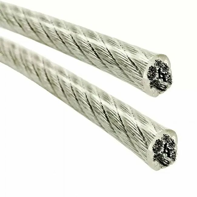 Трос стальной оцинкованный в ПВХ оболочке, часто применяемый канат в морском деле, хозяйственном, монтажно-тяговых механизмах. Состоит оцинкованный стальной канат из оцинкованных стальных проволок свитых между собой, внутри которого пеньковый сердечник пропитанный